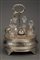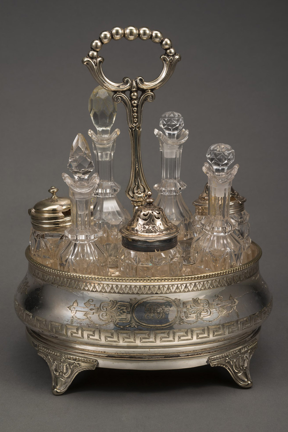Cruet con base in metallo argentato di forma bombata con fascia cifrata ed incisa a volute e motivi concatenati, presa ad anello (largh. cm 21) (bottiglie non coeve, difetti) Cruet with silver metal base (bottles of a different period, defects)