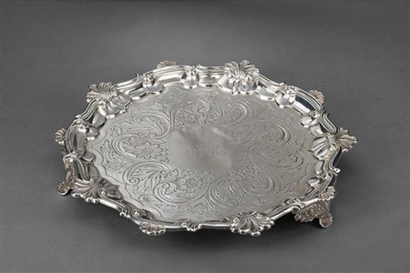 Salver in argento con bordo a volute mistilinee intercalate da motivi a ventaglio. Cavetto sagomato e fondo cesellato con fiori e motivi vegetali centrati da cifre intrecciate. Quattro piedini fogliati. Londra, 1828, argentiere Jonathan Hayne. Si allega certificato di Nicoletti Egidio (d. cm 23) (gr 420 ca) (lievi difetti) Silver salver. London, 1828 (minor defects)