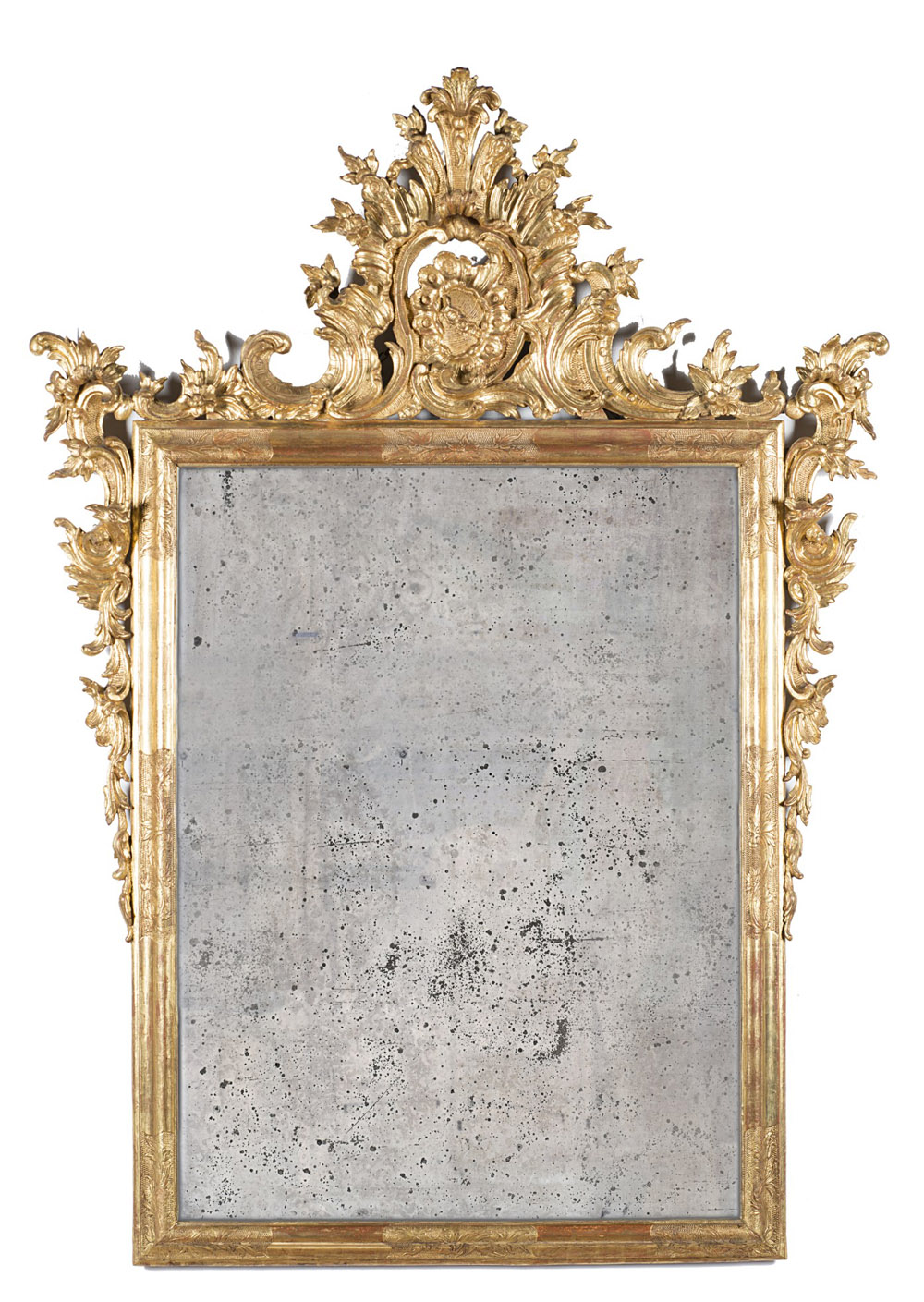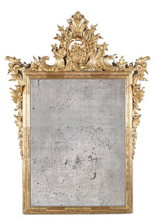 Specchiera in legno intagliato e dorato, cimasa traforata con fiori e foglie, pendenti ai lati. Lombardia, sec. XVIII (cm 148x108) (difetti, restauri alla doratura) 18th-century Lombard carved gilt-wood dresser (defects, gilt restorations)