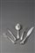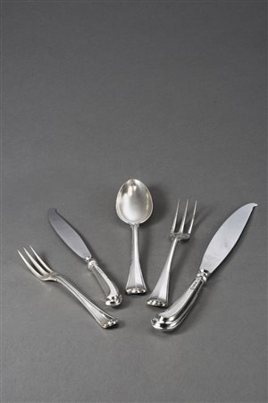 Servizio di posate in argento San Marco composto da dodici forchette, dodici coltelli, dodici cucchiai, dieci forchette frutta, dodici coltelli frutta. Argenteria Clementi Bologna, anni '30. Marchio del Fascio (gr 2600 ca) Silver flatware set. Bologna, 1930s