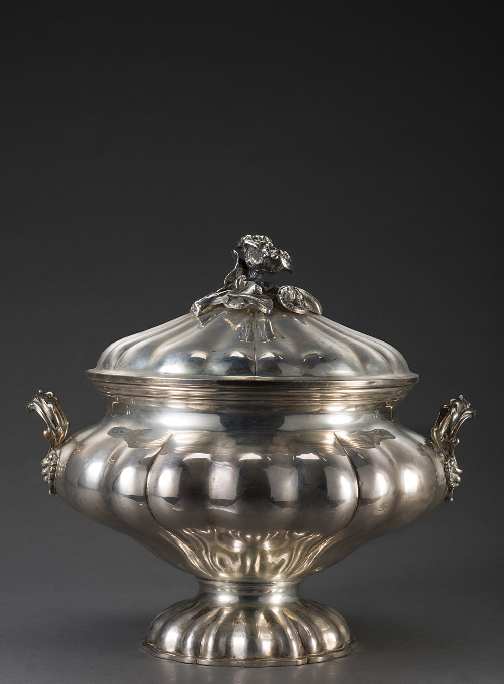 Zuppiera in argento di forma circolare, corpo baccellato e costolato. Manici...