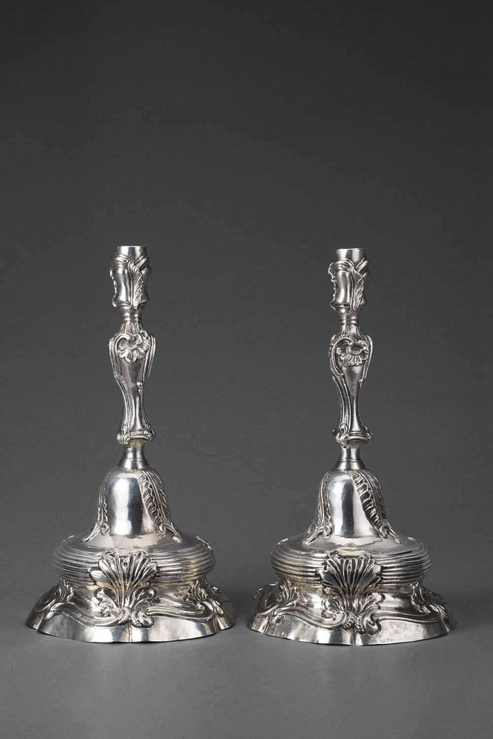 Coppia di candelieri in argento nello stile del barocchetto genovese, base...