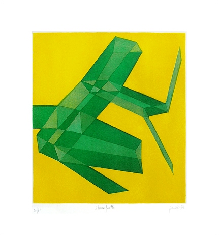 ACHILLE PERILLI Roma 1927 Sbucafratte 1974 Acquaforte – acquatinta a colori es.20/60. Firma e data in b. a d., titolo in b. al c.; in b. a s. timbro a secco Stamperia Romero, Roma. (69,5 x 50 foglio – 34,3 x 30,7 inc.) Tiratura: 60 es. num. arabi + XXVI es. num. romani + alcuni es. prova. Pubbl.: “La linea astratta dell’incisione italiana, Stamperia Romero 1960 – 1986” a cura di F. Di Castro, Electa Editore, Milano, 1989, n.499. B.A.: 120