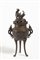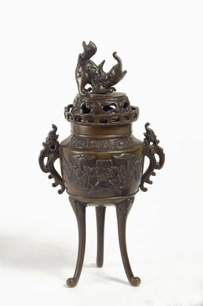 Piccolo brucia incenso in bronzo, piedi terminanti a ricciolo, fusto circolare con decorazioni floreali a rilievo, coperchio traforato con presa zoomorfa, Cina-Indocina, fine XIX sec.