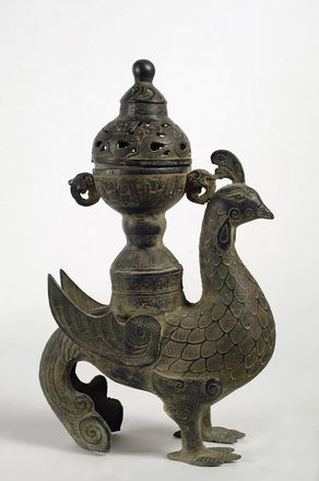Brucia incenso Riproduzione di bronzo arcaico, in ghisa anticata, raffigurante una fenice Zhu, con coperchio traforato e inciso con figure di dragoni, Cina, prima metà XX sec., cm. h. 39.