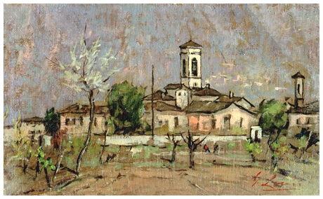 GIOVANNI LOMI Ardenza 1889 – Ardenza 1969 Lago di Lecco; Pescarenico 1935 Olio su cartone telato 17,5 x 29. Firma in b. a d.; sul verso titolo, data e località. Opera pubblicata e conservata negli Archivi Legali Giovanni Lomi, Livorno n.482. Autentica e num. arch. Archivio Giovanni Lomi, Livorno con timbro e firma Massimo Lomi su foto. B.A.: 1.000