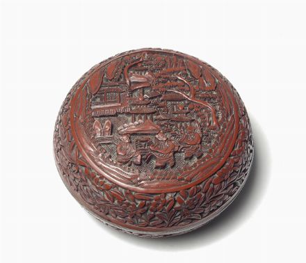Scatola circolare in lacca rossa con intagli a paesaggio e figure, marcato...