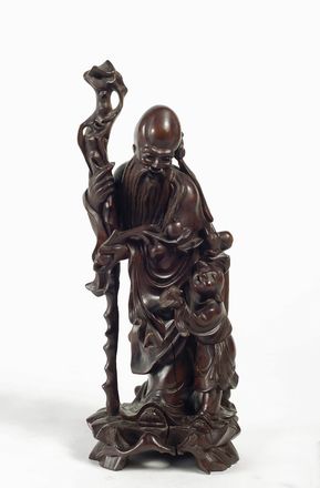 Saggio con bambino scultura in legno di rosa, con piccoli particolari in avorio, Cina fine XIX-inizi XX sec., cm. h. 35.