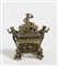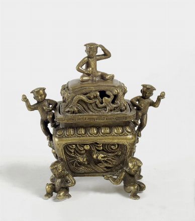 Brucia incenso in ottone, sorretto da quattro putti, fusto rettangolare e coperchio decorato con motivi zoomorfi, maniglie laterali e presa del coperchio a forma di fanciulli, marcato sul fondo, Cina, fine XIX sec.