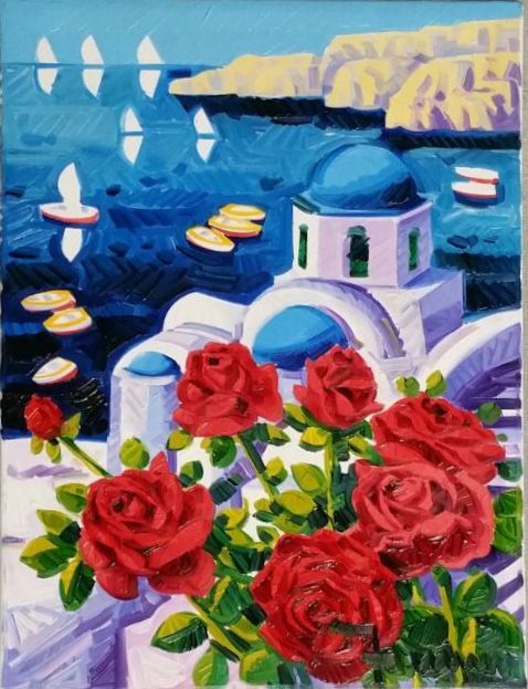 Athos Faccincani "Le rose rosse e la cupola blu" 2011 olio su tela cm 40x30 autentica dell'artista su foto