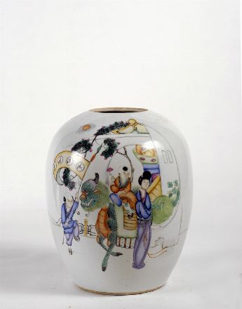 Giara a melone in porcellana, decorata in stile famille rose, Cina XIX-XX sec.