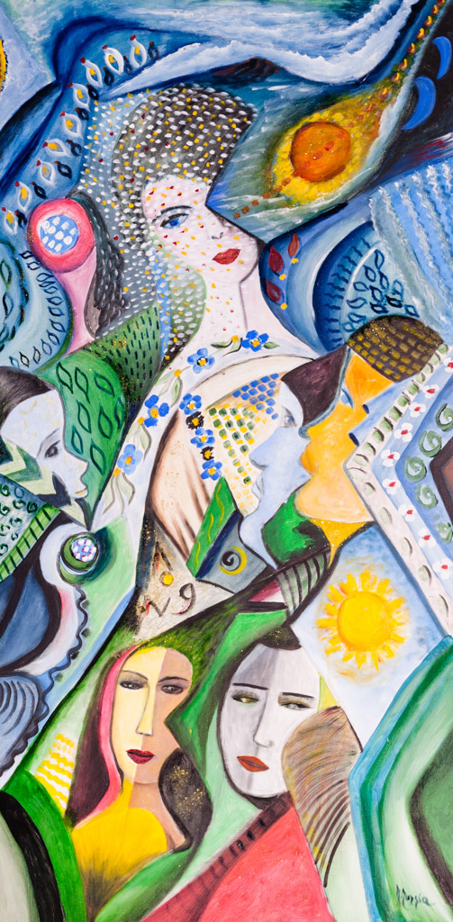 Maria Murgia "Confusione in amore…Nel futuro! Caos..." Olio su tela cm 120x60 - Firma in basso dx e sul retro -Autentica dell'artista su foto