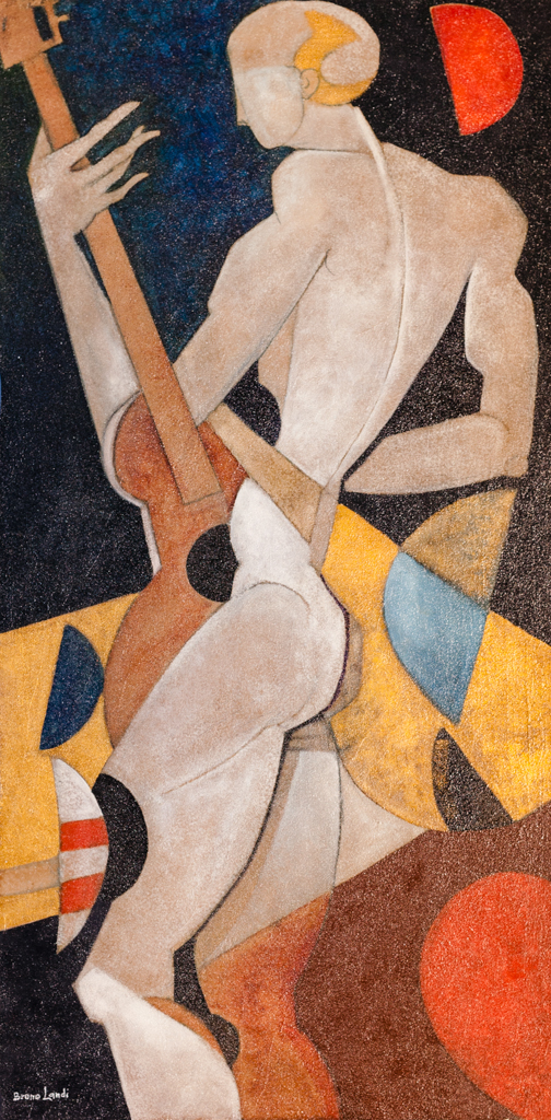Bruno Landi "Suonatore di chitarra" 2015 olio, smalti e sabbia su tela cm 120x60 - Firma in basso a sx - Autentica dell'artista su foto