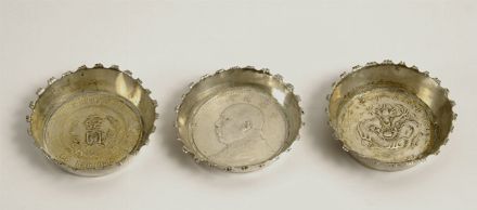 Tre monete cinesi in argento montate a piccolo piatto, Cina, inizi XX sec.