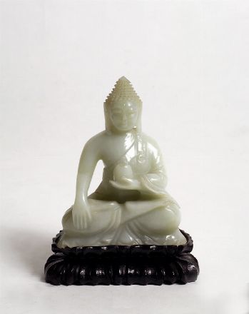 Buddha scultura in giada, su base lignea intagliata, Cina, inizi XX sec., cm....