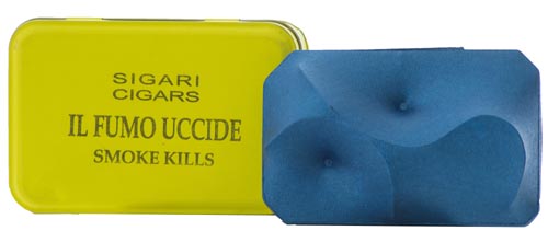 Giuseppe Amadio Todi (Pg) 1944 Smoke Kills , Tela estroflessa, cm. 9,5x14 posta all'interno di cofanetto porta sigari. L'Opera prende l'idea dagli avvertimenti scritti su ogni confezione di sigarette e sigari per la nocività del suo contenuto. Egli pone all'interno dei cofanetti un suo originale estroflesso per ricordare che l'arte è creatività e vita al contrario del fumo che uccide., Sul verso: scritto di Autenticità dell'Artista con timbro, firma e descrizione. Certificato di Autenticità dell'Artista.