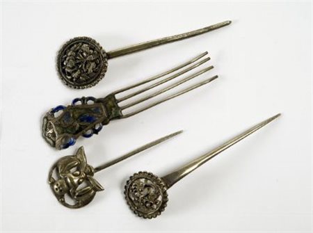Quattro spille per capelli in argento, due con marchio, Cina, fine XIX.inizi...