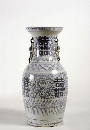 Vaso in porcellana bianca e blu, decorato con ideogramma della Doppia Felicità, Cina, fine XIX sec., cm. h. 45.