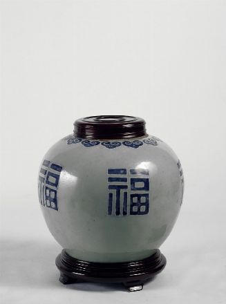 Giara a cipolla in porcellana celadon con decorazioni a ideogrammi bianche blu, marchiata sul fondo, Cina, periodo Quianlong.