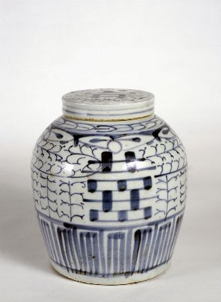 Giara da cucina in porcellana bianca e blu, con motivi arabeschi e Ideogramma della Doppia Felicità, Cina, fine XIX sec.