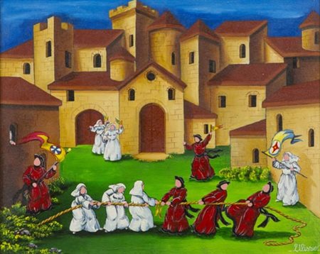 Ulisse Osimo (An) 1957 La sfida del secolo 2002, Olio su tavola, cm. 40x50 Firmato in basso a destra; Sul verso: titolo ed Autentica dell'Artista con timbri e Archivio n° 02/90UZ/MI/A. Certificato di Garanzia "Istituto Diffusione Arte", Osimo, An, con Archivio n° 02/90UZ/MI/A.