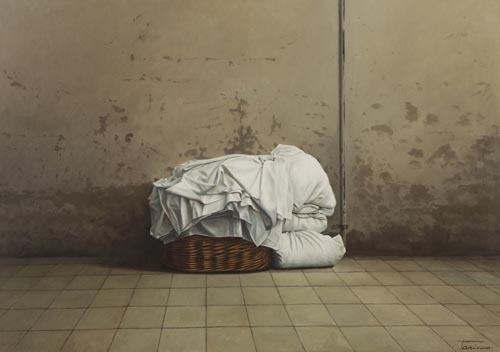 Michele Tarrico Trieste 1927 Cesto di Biancheria , Olio su tela, cm. 50x70 Firmato in basso a destra; Sul verso: Etichetta "Galleria d'Arte Canci", Lerici, con descrizione e timbri.