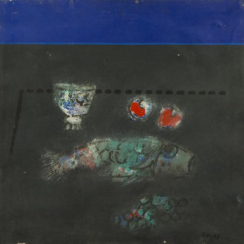 Manlio Bacosi Perugia 1920 Perugia 1995 Pesce e frutta , Olio su tela, cm. 60x60 Firmato in basso a destra; Sul verso: firma e titolo; Timbri di provenienza.