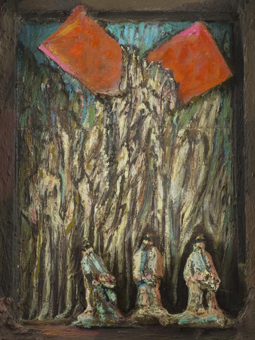 Roberto Barni Pistoia 1939 Senza titolo 1985, Pittoscultura di cm. 80x60x9, in teca di legno apribile. Autentica dell'Artista su foto.