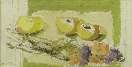 Franco Marzilli Roma 1934 Natura morta , Olio su tela, cm. 35x65 Firmato in basso a sinistra; Etichetta Arte Fiera, Bologna 1991.