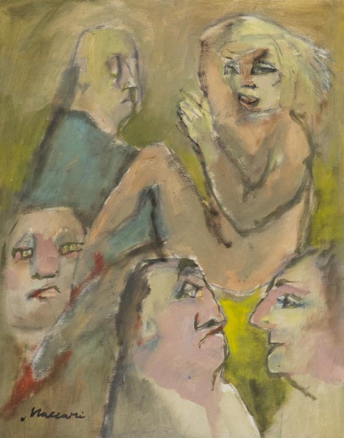 Mino Maccari Siena 1898 Roma 1989 Figure anni '80, Olio su tela, cm. 50x40 Firmato in basso a sinistra. Autentica di Marco Maccari su foto con numero di Repertorio.