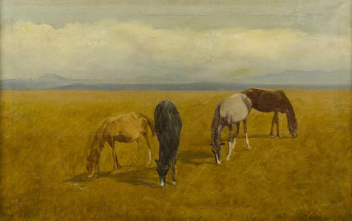 Enrico Coleman Roma 1846 1911 Cavalli al pascolo , Olio su tela, cm. 50x79 Firmato in basso a destra. La tela presenta lievi imperfezioni.