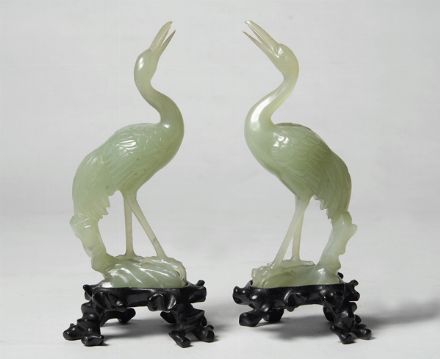 Coppia di ibis in giada nefrite, su basi di legno dipinto, Cina, inizio XX sec.