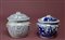 Due cache pot di diversa fattura in porcellana bianca e blu, con decorazioni floreali, coperchi con presa a forma di cane di Pho, Cina, XIX sec.