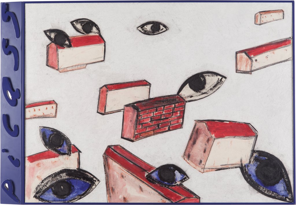 mixed media and collage on paper laid on board in a painted metal frame 30x43,3 in