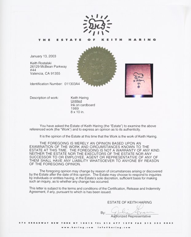 certificate of authenticity issued by "The Estate of Keith Haring" n. 011303A4