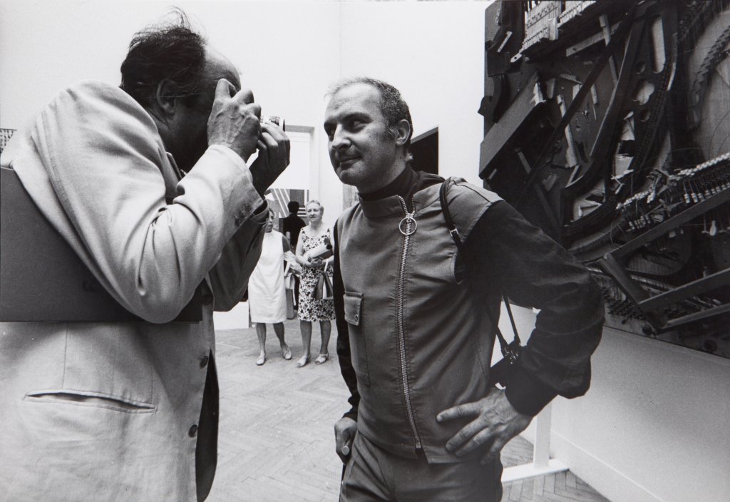 Arman, con il giornalista Rolly Marchi fotografato davanti al suo Chopin's Waterloo, alla XXXIV Esposizione Biennale Internazionale d'Arte