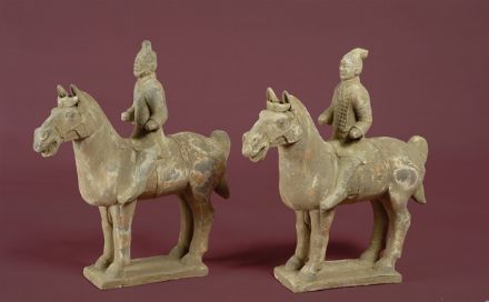 Coppia di guerrieri a cavallo Sculture in terracotta, con tracce di policromia, Cina, periodoTang, cm. 38x34.