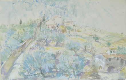Virgilio Carmignani (Empoli, 1909 - 1992) CAMPAGNA CON CASE, 1989 Tempera su carta, cm. 16x25