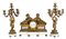 TRITTICO composto da OROLOGIO in bronzo dorato con putti superiori e placche in porcellana di Sevres dipinte a motivo floreale e da due CANDELABRI a 5 luci in bronzo dorato sorretti da putti, basi in marmo bianco. Francia XIX secolo Misure: h cm 30 - h cm 44