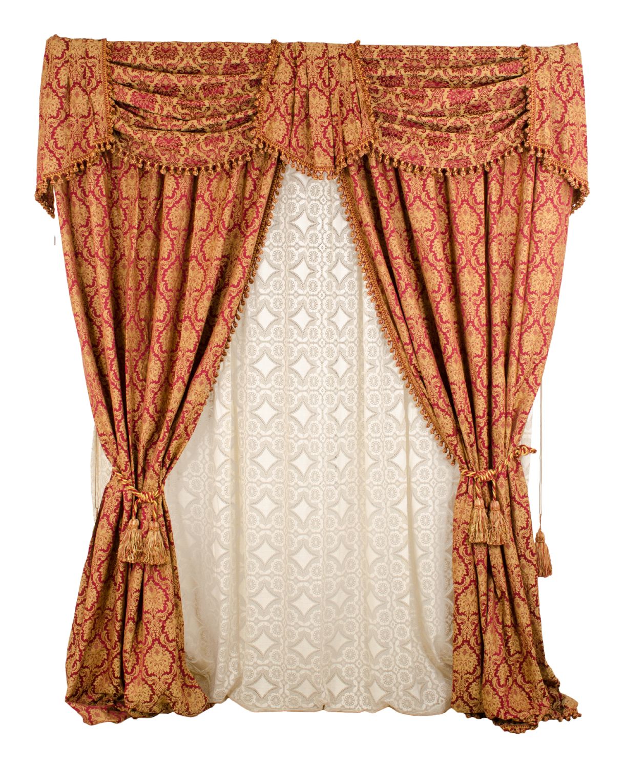 TENDA in cotone damascato nei toni del bordeaux e oro con interno ricamato a motivo floreale nei toni del bianco. Misure: cm 275 x 206