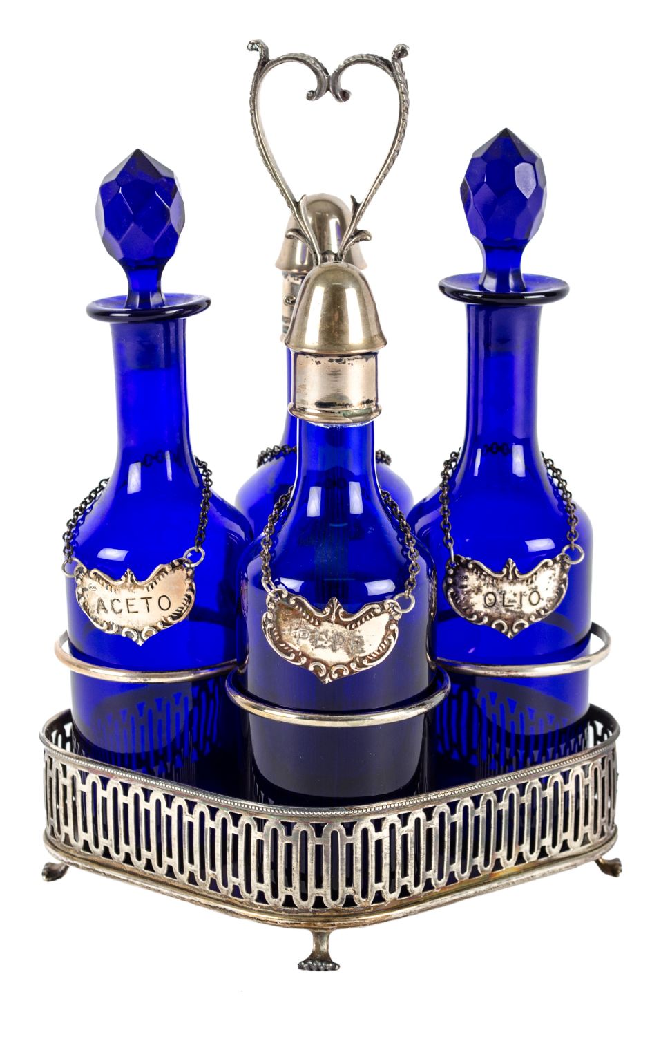 MENAGE in argento con bottiglie in vetro nei toni del blu. XX secolo Misure: cm 16 x 13 x h 24