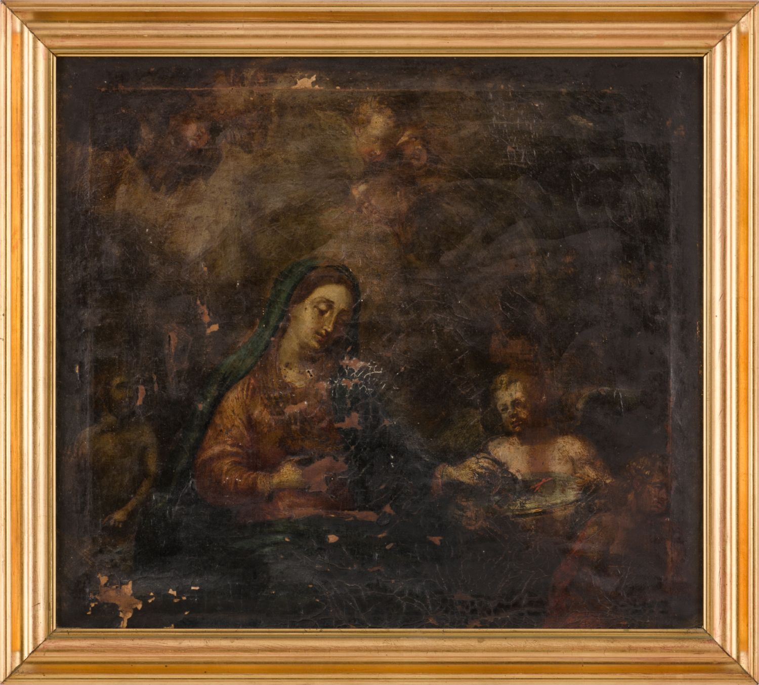 OLIO su tela "Madonna con Angeli" entro cornice non coeva. Sicilia XVIII secolo Misure: cm 49 x 55