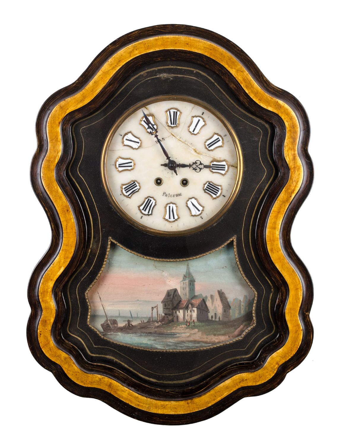 OROLOGIO occhio di bue in vari legni con pittura raffigurante "paesaggio con personaggi" (quadrante rotto). Primi '900 Misure: cm 51 x 16 x h 72