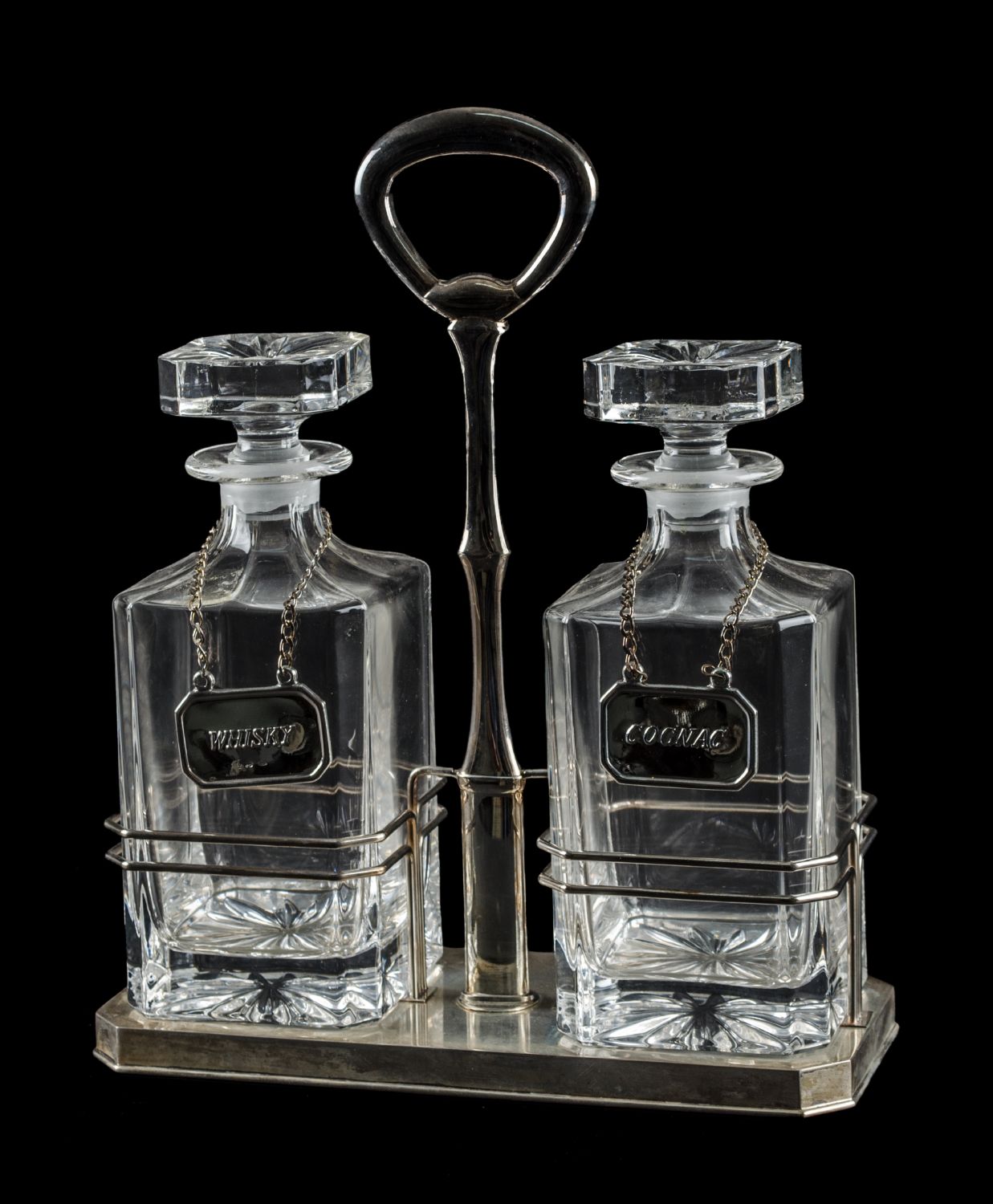 PORTALIQUORI in argento con bottiglie in vetro. XX secolo Misure: cm 26 x 11 x h 33