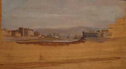 Renato Zini (Firenze, 1890 - 1969) PAESAGGIO CON PONTE, 1943 Olio su tavoletta, cm. 11x20 Firma e data in basso a sinistra.
