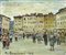 Guido Borgianni (New York, 1915 - Firenze, 2011) MERCATO IN PIAZZA, 1962 Olio su cartone telato, cm. 38x46 Firma e data in basso a sinistra. Sul verso: firma. Autentica dell’autore su foto.