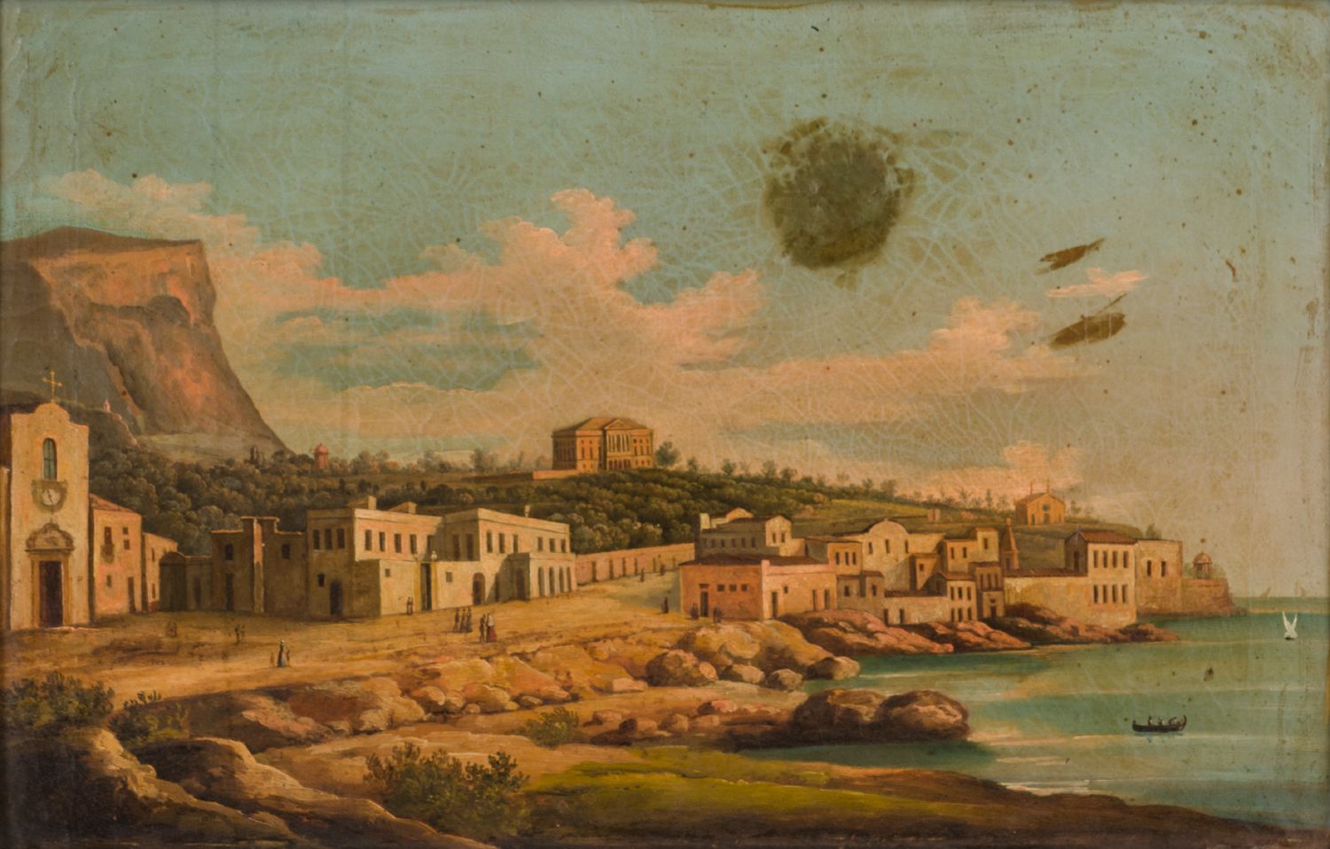 OLIO su tela "veduta dell'Acquasanta a Palermo" entro cornice a canna ciaccata. Sicilia XIX secolo Misure: cm 42 x 64