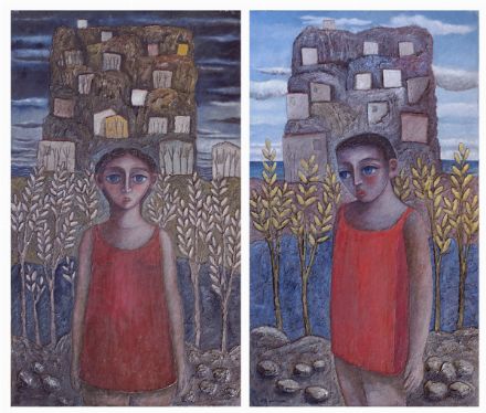 Elio De Luca (Cosenza, 1950) IL GIORNO E LA NOTTE (DITTICO) Cemento dipinto ad olio, cm. 120x70 (ciascuno) Firmati in basso a sinistra. Sul verso: timbro dell’autore, titolo e firma. Autentiche dell’autore su foto.