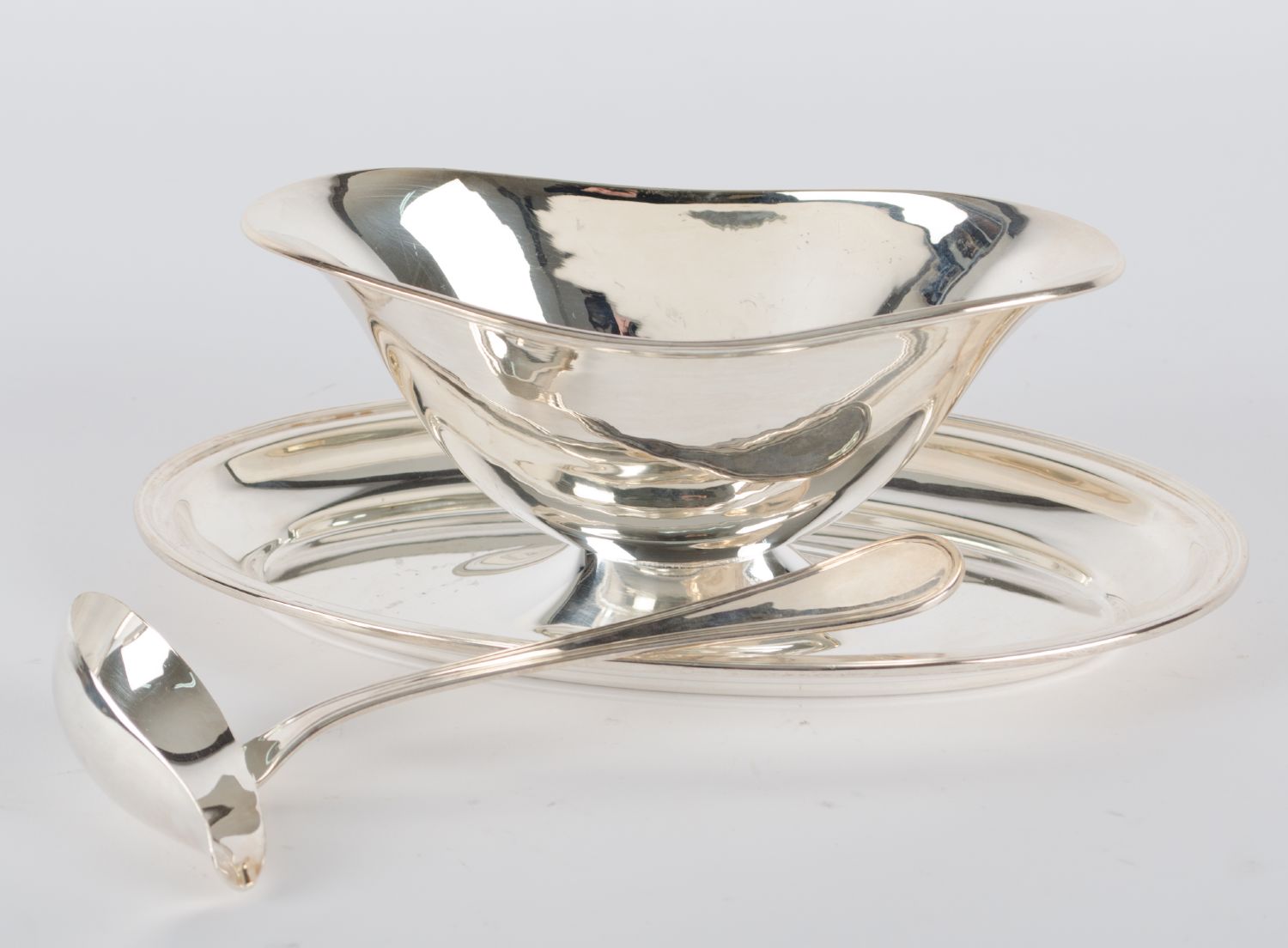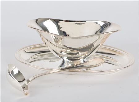SALSIERA con mestolo in argento (g. 493). XX secolo Misure: cm 23 x 14 x h 8