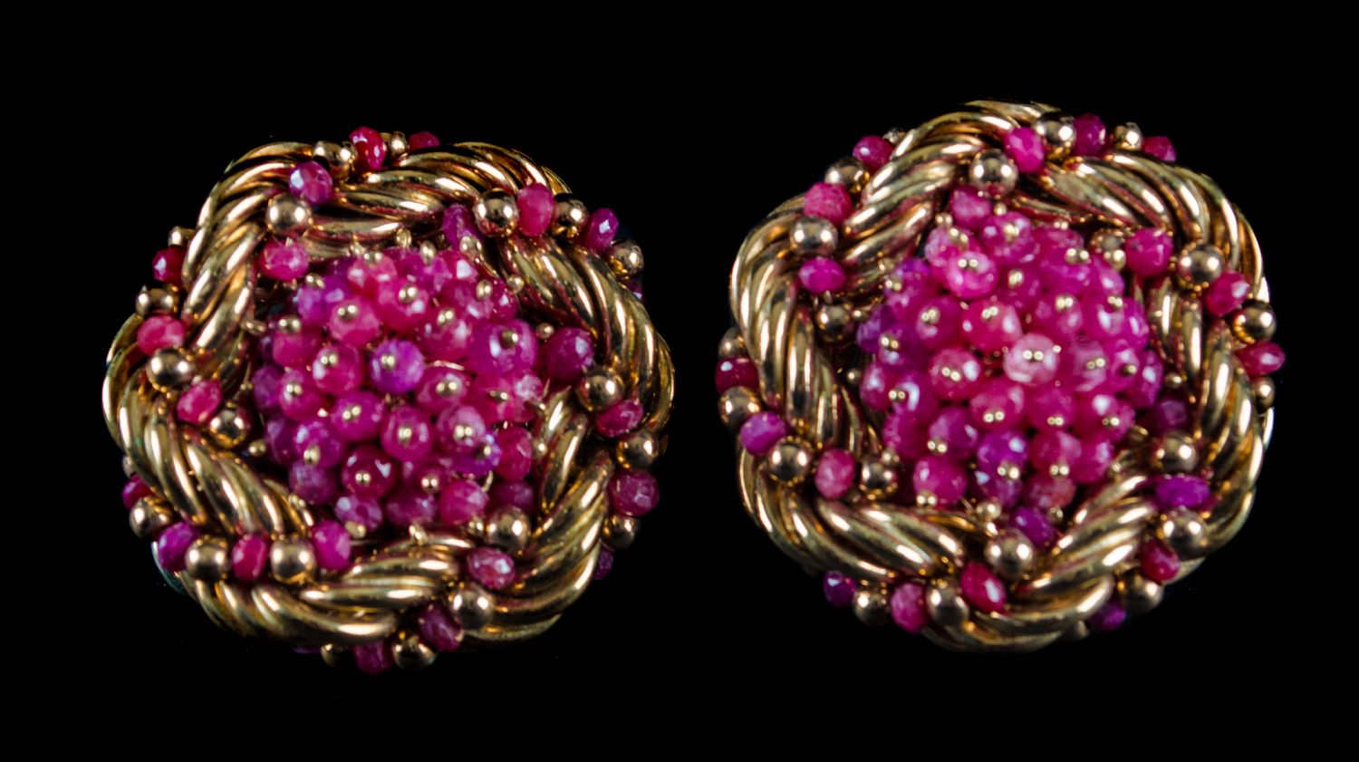 ORECCHINI a bottone in oro rosso 18 Kt. con rubini sfaccettati.